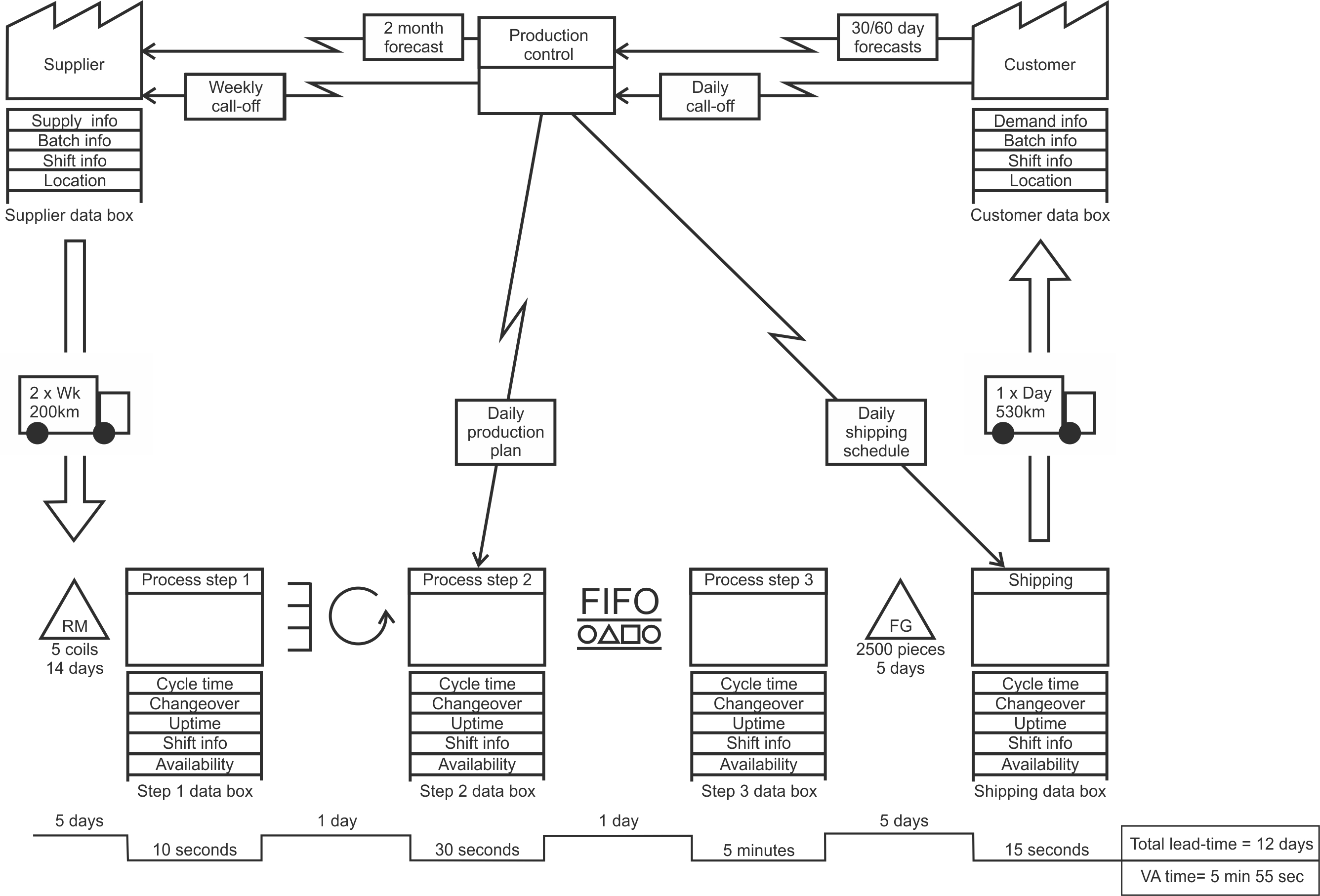Figure A.2 shows a typical VSM. The customer(s) is always placed in the top right hand corner of the map. The supplier(s) is placed in the top left hand corner of the map. Along the bottom, flowing left to right, is the material flow. In the middle of the map it the information flow. In the bottom left hand corner is the RMI. Deliveries from the supplier into the RMI are illustrated with the big open, downward pointing arrow. The transportation mode is also illustrated here. In the bottom right hand corner is the FGI, from which we satisfy customer demand. Deliveries from the FGI to the customer are illustrated by the big open arrow, upward pointing arrow. The transportation mode is associated with the delivery arrow.