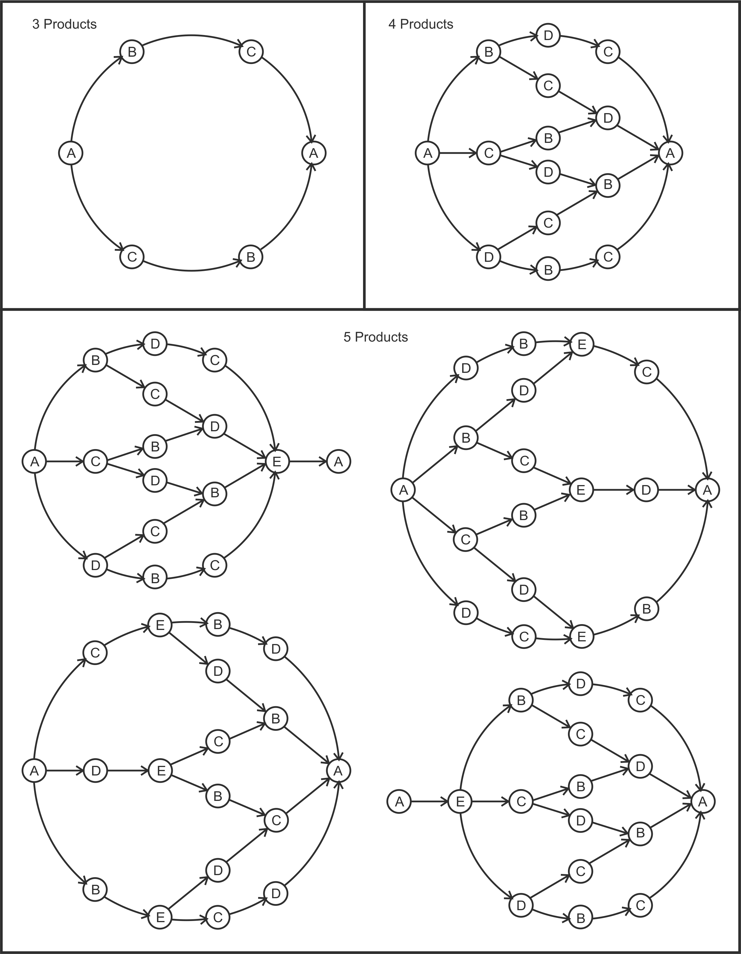Figure E.1 can be used find the shortest path from A to A through the product wheel. The five product graph requires us to solve all four graphs concurrently; make one move on each graph in turn, the first one to complete will be the shortest path. If more than one graph completes in each round, select the shortest one. There maybe more than one sequence (or path through the network) with the same shortest time, indicating that there are multiple solutions to the problem.