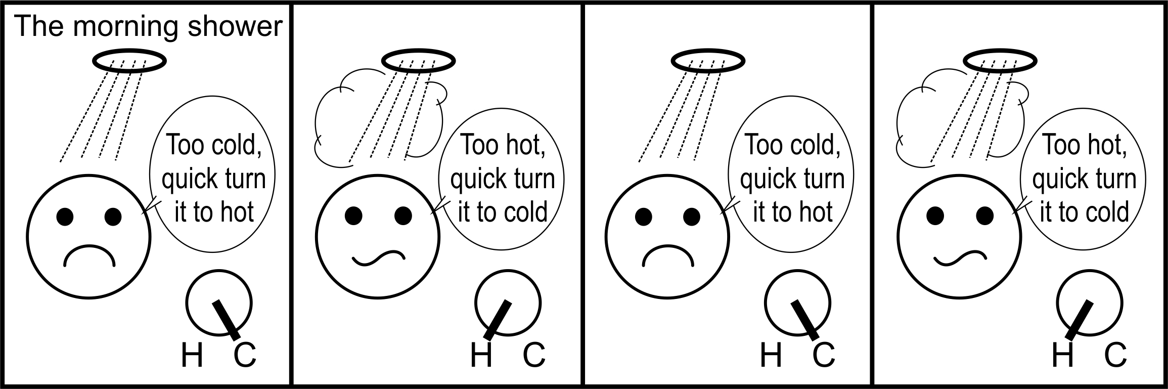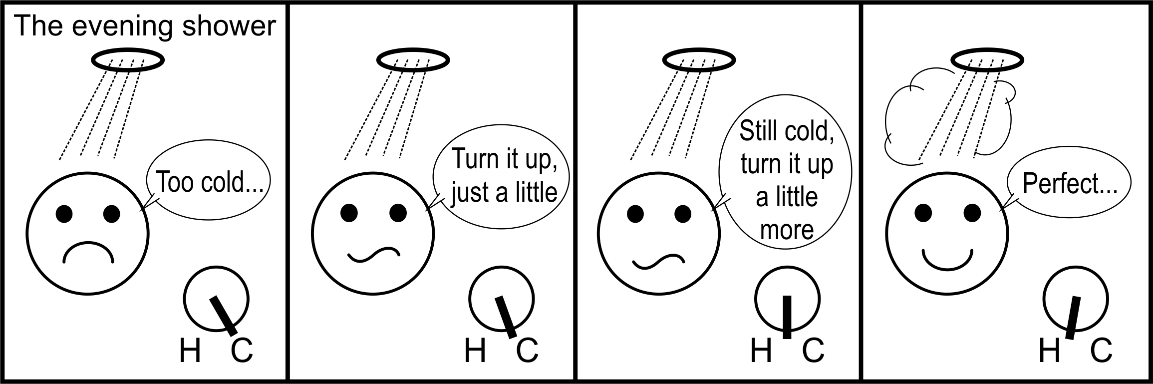 Managing supply chains is a bit like taking a hot shower. When in a shower we want to match the temperature of the water to what we find comfortable. In a supply chain, we want to match supply with demand. There is a lead time between the action (turning the tap, setting production/distribution targets) and the consequence (the temperature of the water falling on our head, receiving the production/deliveries). In the shower, if we turn the tap(s) to quickly the water temperature bounces between the extremes of too cold and too hot, see Figure 2.2. This analogy is a fair representation of an OUT controlled supply chain. The OUT policy reacts very quickly to deviations from targets. Next, we will consider a modification to the OUT policy where we turn the taps slowly to match supply with demand. This modified policy is known as the proportional order-up-to (POUT) policy.