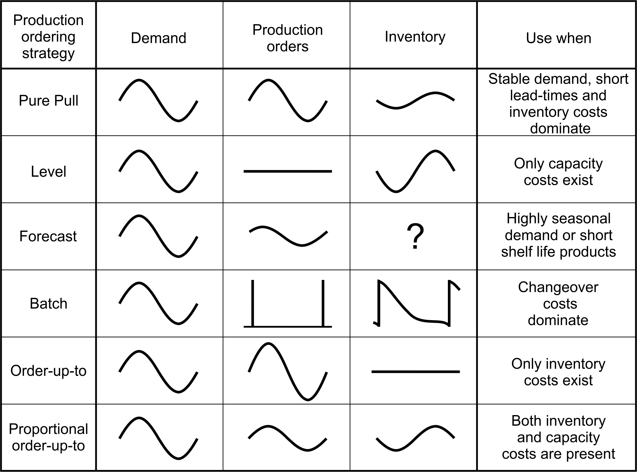 | Forecast Produce to a forecast. | Easy to communicate and implement. Some balance between capacity and inventory is achieved. | No inventory feedback is present, so inventory levels are uncontrolled. Trends in demand are forecasted but, due to the lead-time, the average inventory levels do not converge to the safety stock target. | Demand has no trends & has little variability. High-volume demand produced every period. Capacity, inventory & backlogs have costs. Lead-times are short. |
