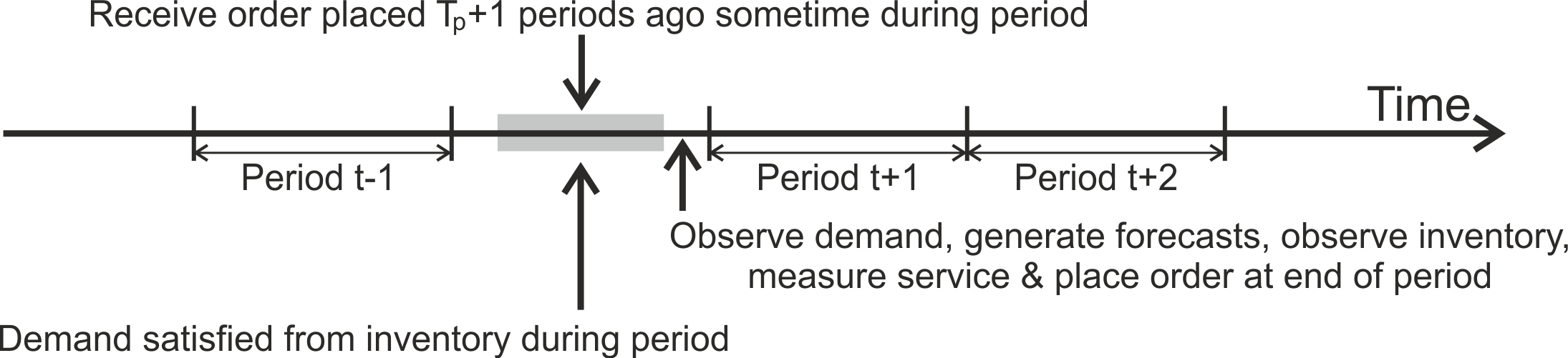 Note, even if the physical lead time is instantaneous, the products ordered will only be received and be ready to satisfy demand in the next period; the consequences of this would not be considered until the next order is placed (at the end of the following period). Further note, if the replenishment orders were placed at the very beginning of a period, it would still be based on the same information as an order was placed at the very end of the previous period; all that changes is the time index of the state variables (the inventory, orders, WIP, and forecasts are the state variables).