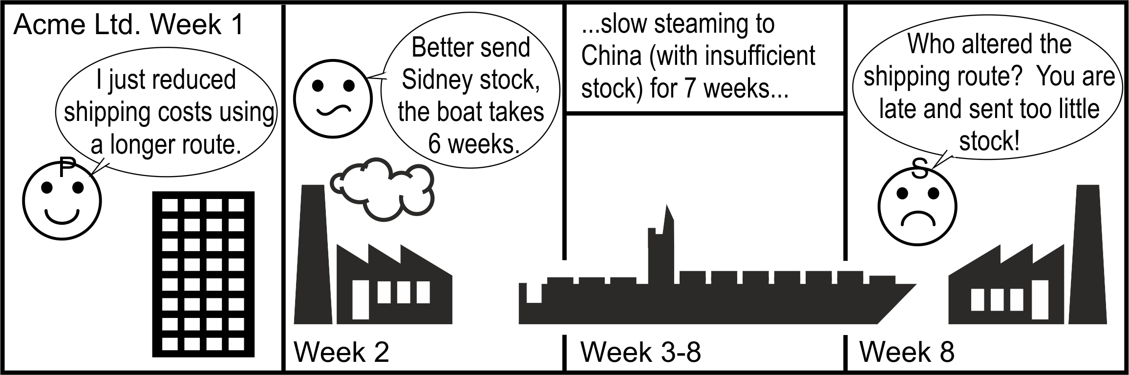 The lead time includes the time to place an order, manufacture product, pack, assemble shipment, ship, transport, and receive that product into a stock location. There will be many instances where a lead time is defined in an ERP system. For example, lead time information will be defined, stored, and used in the planning book, supplier contracts and purchasing ledgers, transport routes, and the master bill of materials (BOM) file. Different functions (departments, people) will have responsibility and access/permission to keep that information up-to-date. For example, the production planning team may control the planning book, the purchasing team may set up supplier relationships in the contract files and purchasing ledgers, the transport managers select shipping companies and routes, engineering/design define the BOM. All this lead time information has to be coordinated. Amazingly, most ERP do not have a single global variable for a lead time; there are many instances of this variable and they could be different. Synchronizing lead time information may mean that several fields within your ERP system will need to be checked and possibly corrected. Furthermore, as many people will likely have the opportunity and authority to change lead-time information, ERP lead times changes need to be coordinated in some way. Communicating with, and gaining the necessary buy-in from, all the stakeholders with an interest in lead time changes might be a difficult task, but it is essential for proper supply chain control, see Figure 4.2. The challenge is to find a lead time updating protocol that is not unduly slow and burdensome.