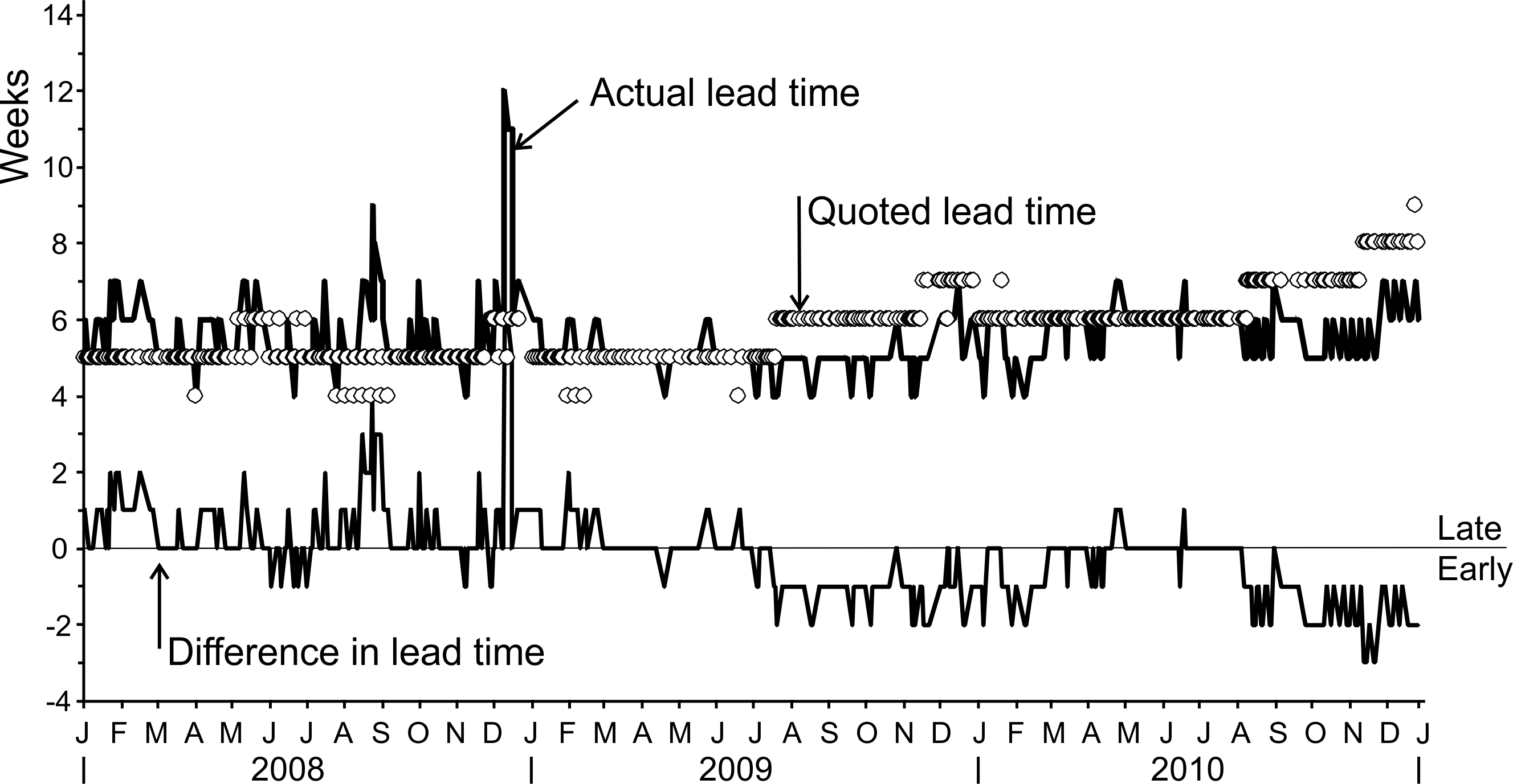 There are many factors that affect the actual physical lead times: 1) natural variability of the lead times resulting from factors such as the weather, congestion, and customs delays, 2) seasonal variability, 3) special causes. Figure 4.3 provides an example of real lead times in two forms; the lead time that was quoted by the freight forwarding company at the time of dispatch and the actual lead time recorded when the shipment was received. We can see from Figure 4.3 the quoted lead time is a variable itself. It experiences seasonal effects (December and January have higher quoted lead-times). The actual lead times are more consistent, but still variable. Interestingly, throughout 2008, most of the actual lead times were longer than the quoted lead time. However, for the period from June 2009 through 2010, most actual lead times were shorter than the quoted lead time. This may be due to factors outside of the shipping company’s control; bad weather, berth availability at ports, custom delays, lack of transportation capacity for hinterland distribution, for example. However, it should be clear that you should monitor the actual lead times yourself and keep a good record of what is actually happening.