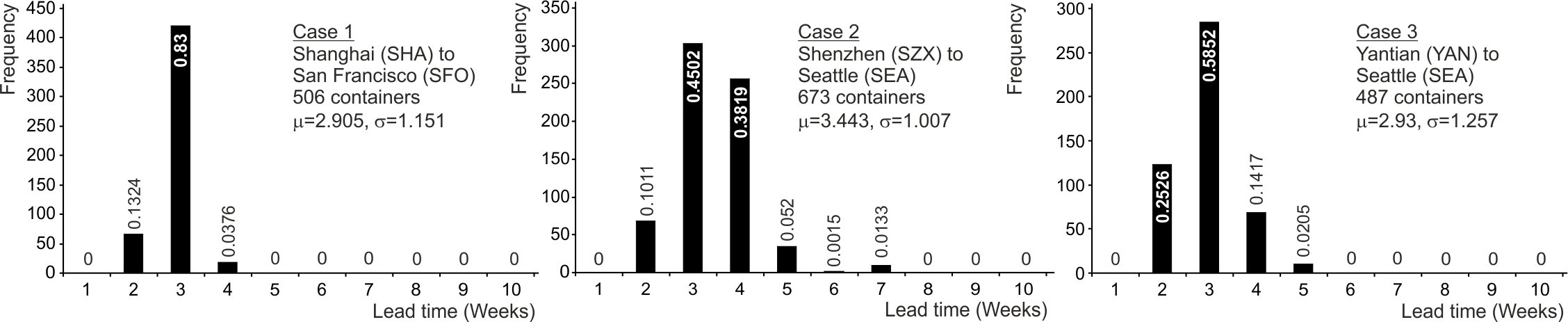 If we had a historical time series of actual shipments, detailing when they were shipped, and when they arrived, we can identify the average lead-time as illustrated in the following example.