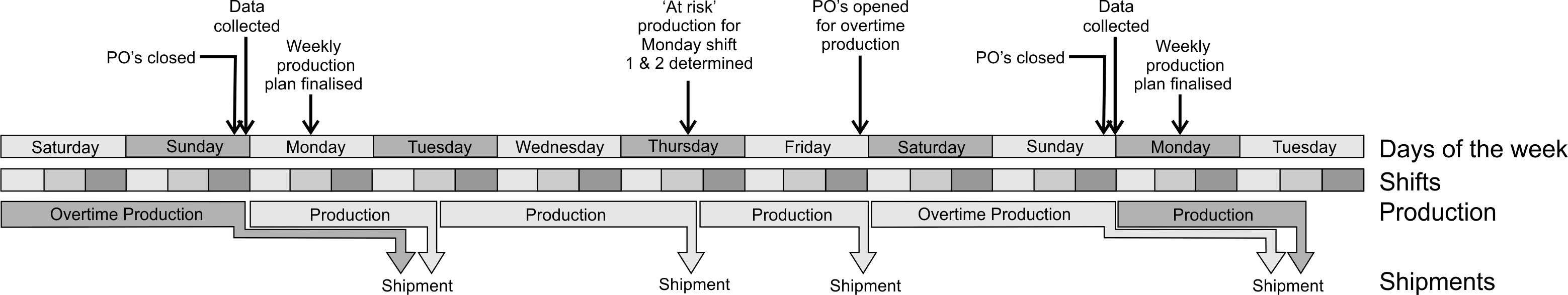 During periods of high demand, you may be using overtime on the weekend to meet weekly production targets. This could create some issues with the integrity of the data if not handled correctly. For example, assume Sunday 23.59 GMT is the end of one planning period, Monday 00.00 GMT is the start of a new planning period. White collar workers (doing the production planning, transportation, etc.) work 9.00-17.00 Monday through Friday. Overtime might be conducted over the weekend and products not shipped to customers until Monday when the logistics team next comes back to the office. If the weekend production is assigned to inventory in the following week, then the ERP system will erroneously count it as inventory and reduce the production orders in the next order calculation. The weekend production should be allocated to a purchase order (PO) opened in the previous week, and then it will not be counted as inventory; rather it will properly assign last week’s production as goods-in-transit to the customer. Furthermore, unallocated inventory (if weekend production was more than the open PO quantities) will be considered as current inventory and next week’s production will be reduced. If the PO quantities were not met then (if weekend production did not achieve the targets), the unmet demand would also be added to next week’s production. Figure 4.14 illustrates the sequence of events and how purchase orders can be used to coordinate the scheduling, production, and shipping activities.