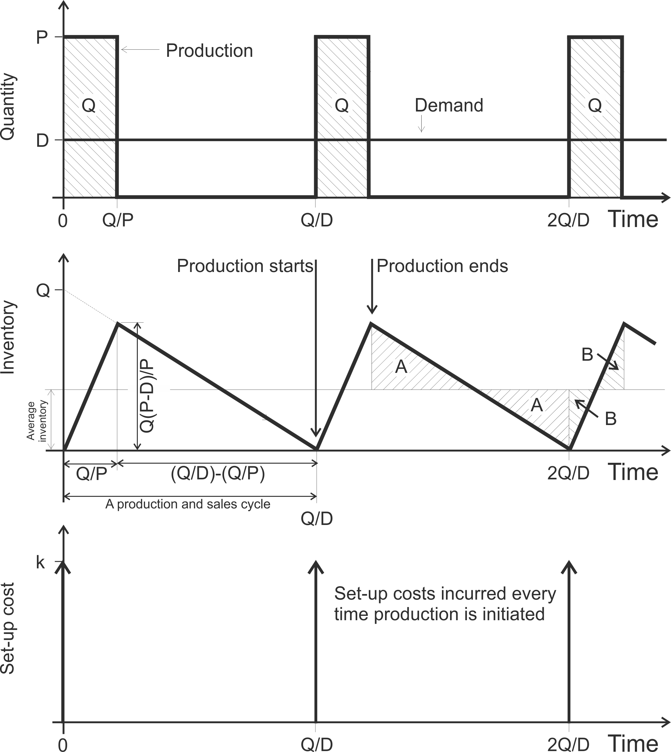 The direct production costs are incurred during the periods when we are manufacturing product. As product is manufactured at a rate of \(P\), direct production costs are incurred at a rate of \(cP\). After \(Q\) items have been made the production is turned off, \(Q/P\) years after it was started (remember \(P\) is an annual production rate, so \(Q/P\) is a proportion of a year). During the period when production is running, as \(P > D\) then inventory has been building up at a rate of \(P-D\). When production is ceased, the inventory level is at \(Q(P-D)/P\) and the inventory depletes thereafter at a rate of \(-D\). Just at the instant that inventory falls to zero (at \(Q/D\) years after the last set-up was conducted), we assume production is initiated again and inventory builds up. The annual inventory costs is given by \[ \text{Inventory costs}=\frac{hQ(P-D)}{2P} \tag{4.38}\] where \(h\) is the unit holding cost. Every time the production is started up a set-up cost of \(k\) is incurred. As there are \(D/Q\) setups per year, the annual set-up costs will be given by \[ \text{Set-up costs}=\frac{kD}{Q} \tag{4.39}\] The annual direct production costs are given by \[ \text{Production costs}=cD \tag{4.40}\] where \(c\) is the unit cost of production. Figure 4.15 sketches the time evolution of the three components of the EPQ costs.