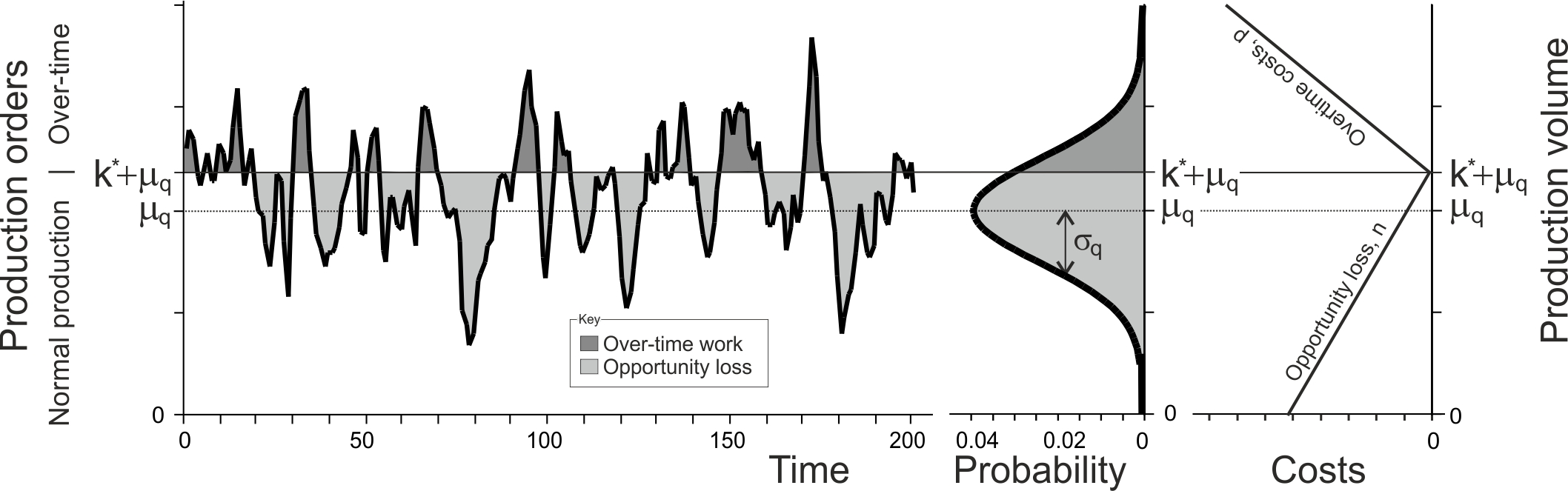 | The economic production quantity | \(Q^\star = \sqrt{\frac{2 P D k}{h(P-D)}}\) |